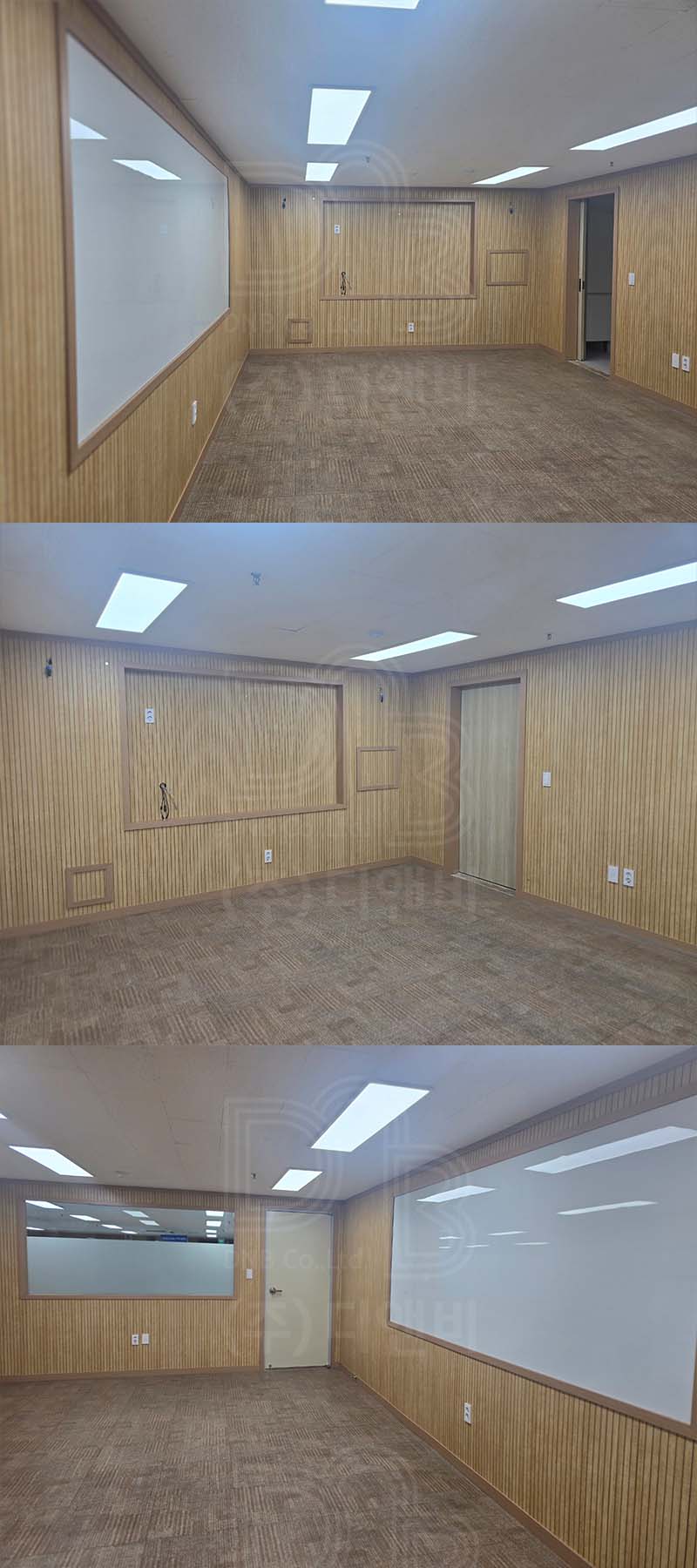 좌측 벽면은 매입형 화이트보드를 적용해 판서가 가능하도록 하고, 벽체 전면에 라인타공흡음판 마감을 적용하여 음향 반사율을 낮췄습니다. 우측에는 슬라이딩도어를 설치해 탕비실과 연결되도록 설계했으며, 도어는 벽면 마감과 같은 색상 계열의 필름으로 마감해 시각적 통일감을 주었습니다.