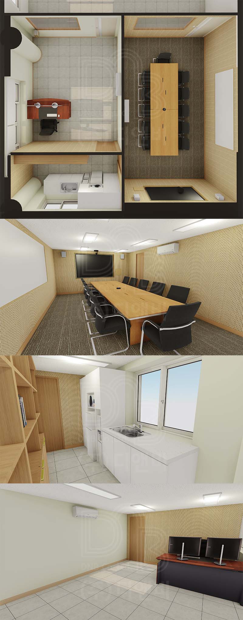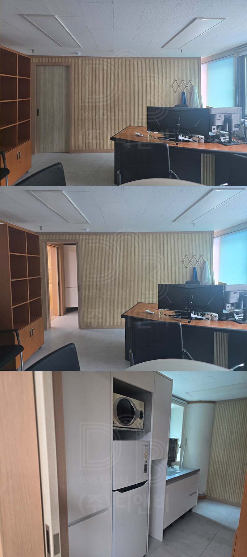 기존 공간은 회의실과 탕비실, 청소용구 보관공간이 복합되어 사용되고 있었으며, 음향·조명·공간 구조 모두 화상회의 환경에 적합하지 않았습니다. 이에 따라 기존 회의실은 통합형 화상회의실로 재구성, 원장실의 후면 일부를 분할해 새로운 탕비실을 조성하고 원장실에서도 바로 접근할 수 있는 내부 도어를 신설하였습니다.