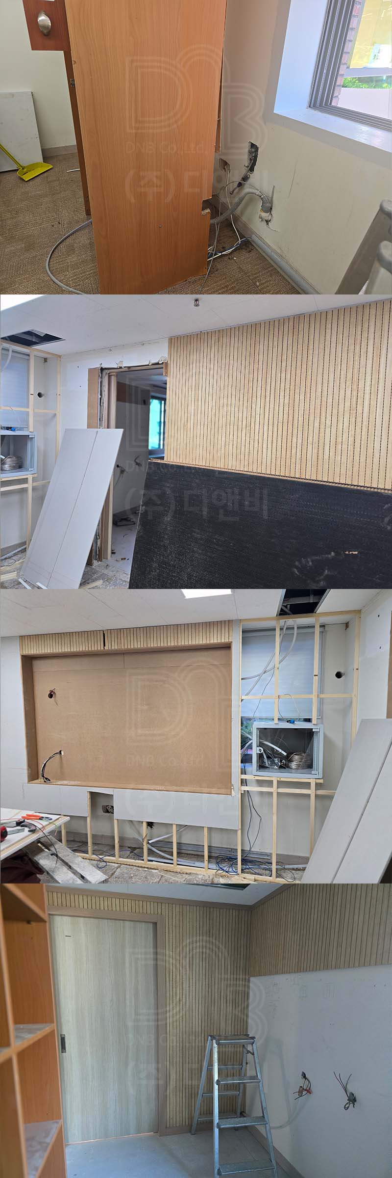 공사 단계에서는 기존 수도 배관의 철거 및 위치 이전 작업이 진행되었습니다. 화상회의 시스템을 위한 TV 및 스피커 매입 공간 조성, 전원 및 통신 배선, 네트워크 배관 공사를 병행했습니다.