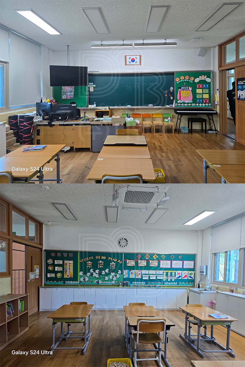 반면 교실은 밝은 색상의 마감재와 실용적인 수납장, 칠판장 구성을 통해
